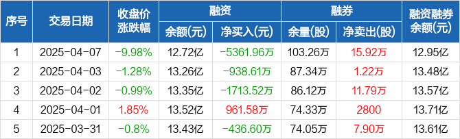 融资方面,当日融资买入5619.58万元,融资偿还1.1亿元,融资净偿还5361.96万元,连续3日净偿还累计8014.09万元。融券方面,融券卖出16.45万股,融券偿还5300股,融券余量103.26万股,融券余额2300.56万元。融资融券余额合计12.95亿元。