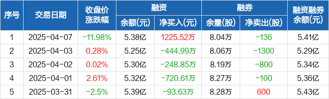 融资方面,当日融资买入3697.55万元,融资偿还2472.03万元,融资净买入1225.52万元。融券方面,融券卖出664股,融券偿还800股,融券余量8.04万股,融券余额352.31万元。融资融券余额合计5.41亿元。
