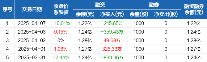 融资方面,当日融资买入364.29万元,融资偿还579.94万元,融资净偿还215.65万元。融券方面,融券卖出0股,融券偿还0股,融券余量1000股,融券余额1.2万元。融资融券余额合计1.22亿元。