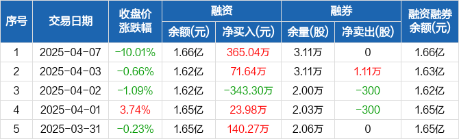 融资方面,当日融资买入1471.19万元,融资偿还1106.15万元,融资净买入365.04万元。融券方面,融券卖出0股,融券偿还0股,融券余量3.11万股,融券余额25.16万元。融资融券余额合计1.66亿元。