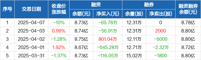 通策医疗融资融券信息显示,2025年4月7日融资净偿还69.78万元;融资余额8.73亿元,较前一日下降0.08%。
