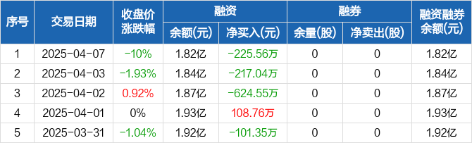 融资方面,当日融资买入861.62万元,融资偿还1087.18万元,融资净偿还225.56万元,连续3日净偿还累计1067.15万元。融券方面,融券卖出0股,融券偿还0股,融券余量0股,融券余额0元。融资融券余额合计1.82亿元。