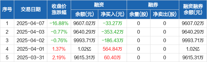 融资方面,当日融资买入1514万元,融资偿还1547.27万元,融资净偿还33.27万元,连续3日净偿还累计573.12万元。融券方面,融券卖出0股,融券偿还0股,融券余量0股,融券余额0元。融资融券余额合计9607.02万元。
