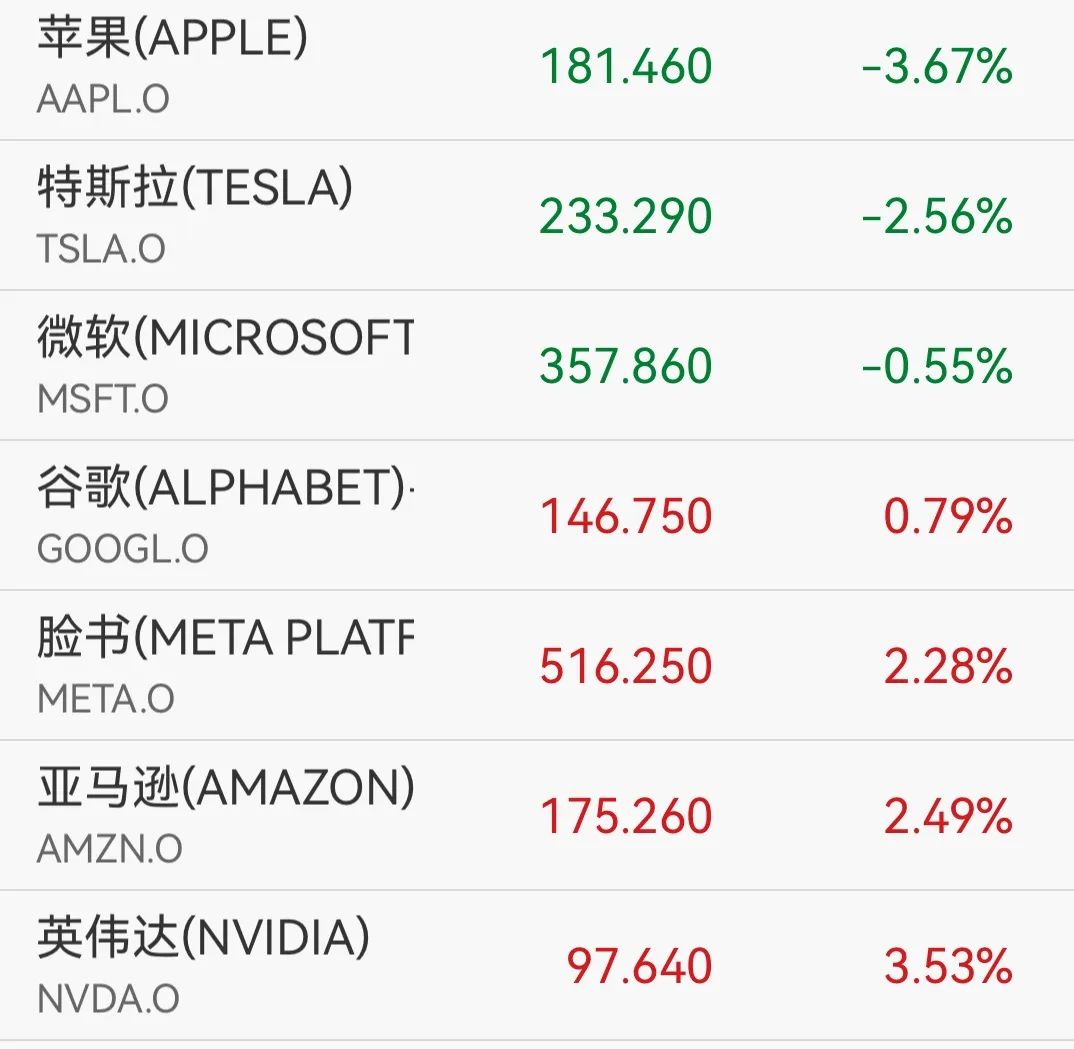 微软跌0.55%,英伟达涨3.53%,亚马逊涨2.49%,谷歌涨0.79%,Meta涨2.28%。