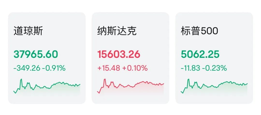 截至收盘,标普500指数跌11.83点,跌幅为0.23%;道琼斯工业平均指数跌349.26点,跌幅为0.91%;纳斯达克综合指数涨15.48点,涨幅为0.10%。