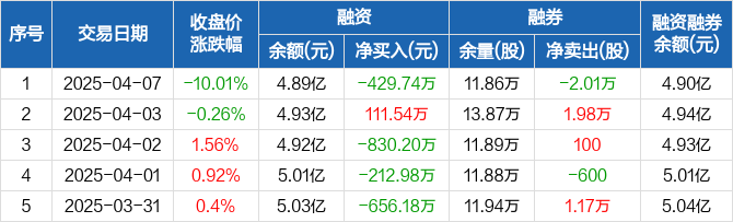 江苏国泰融资融券信息显示,2025年4月7日融资净偿还429.74万元;融资余额4.89亿元,较前一日下降0.87%。