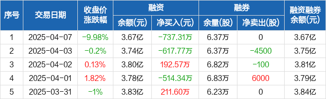 融资方面,当日融资买入1284.9万元,融资偿还2022.21万元,融资净偿还737.31万元。融券方面,融券卖出0股,融券偿还0股,融券余量6.37万股,融券余额86.76万元。融资融券余额合计3.67亿元。