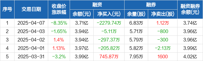 融资方面,当日融资买入3320.79万元,融资偿还5600.53万元,融资净偿还2279.74万元,连续4日净偿还累计2788.05万元。融券方面,融券卖出1.3万股,融券偿还1800股,融券余量6.83万股,融券余额290.06万元。融资融券余额合计3.74亿元。