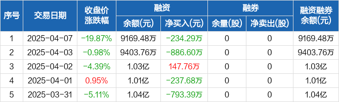 融资方面,当日融资买入1165.72万元,融资偿还1400万元,融资净偿还234.29万元。融券方面,融券卖出0股,融券偿还0股,融券余量0股,融券余额0元。融资融券余额合计9169.48万元。