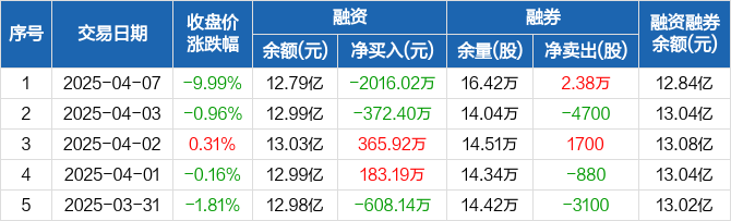 融资方面,当日融资买入4124.92万元,融资偿还6140.94万元,融资净偿还2016.02万元。融券方面,融券卖出2.98万股,融券偿还6000股,融券余量16.42万股,融券余额470.32万元。融资融券余额合计12.84亿元。
