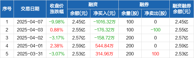 吉宏股份融资融券信息显示,2025年4月7日融资净偿还1016.32万元;融资余额2.45亿元,较前一日下降3.98%。