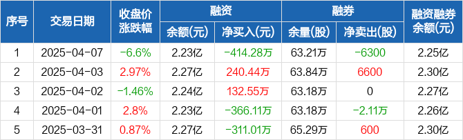 融资方面,当日融资买入2752.4万元,融资偿还3166.67万元,融资净偿还414.28万元。融券方面,融券卖出0股,融券偿还6300股,融券余量63.21万股,融券余额286.34万元。融资融券余额合计2.25亿元。