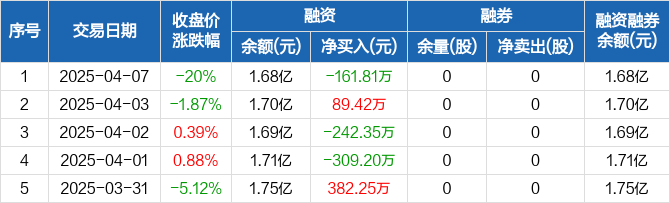 宇邦新材融资融券信息显示,2025年4月7日融资净偿还161.81万元;融资余额1.68亿元,较前一日下降0.95%。