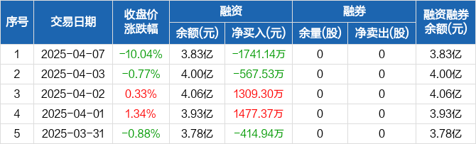融资方面,当日融资买入1653.33万元,融资偿还3394.47万元,融资净偿还1741.14万元。融券方面,融券卖出0股,融券偿还0股,融券余量0股,融券余额0元。融资融券余额合计3.83亿元。