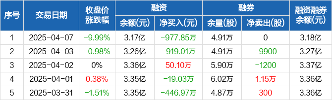 融资方面,当日融资买入1498.21万元,融资偿还2476.07万元,融资净偿还977.85万元。融券方面,融券卖出0股,融券偿还0股,融券余量4.91万股,融券余额80.03万元。融资融券余额合计3.18亿元。