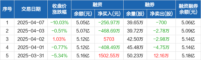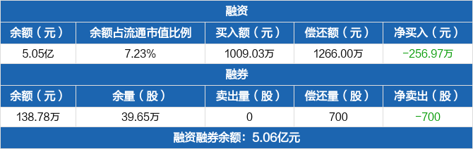 融资方面,当日融资买入1009.03万元,融资偿还1266万元,融资净偿还256.97万元。融券方面,融券卖出0股,融券偿还700股,融券余量39.65万股,融券余额138.78万元。融资融券余额合计5.06亿元。