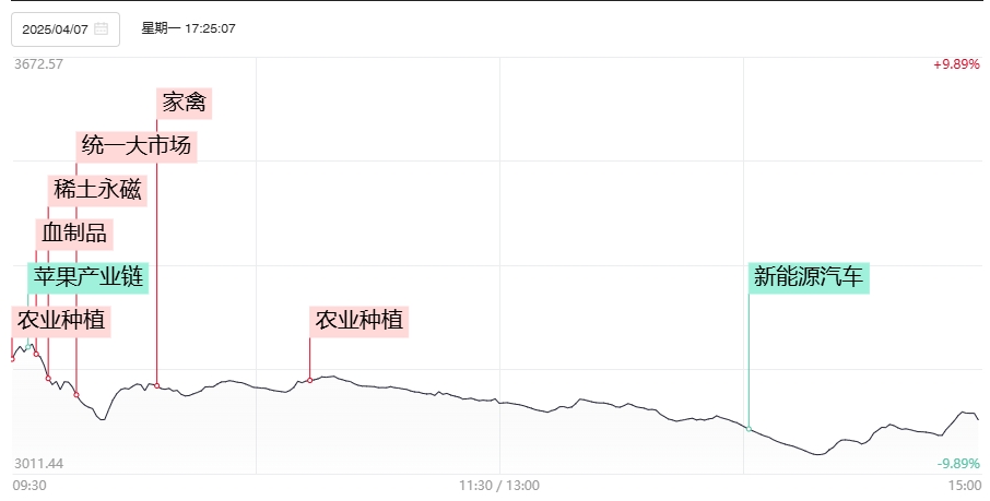 财联社4月8日电,市场全天低开低走,三大指数集体下挫,创业板指跌12.5%,创史上最大单日跌幅,沪指失守3100点,全市场超5200只个股下跌,逾2900只个股跌停。沪深两市全天成交额1.59万亿,较节前放量4502亿。1)4月4日,我国升级对美农产品关税反制措施,这些产品的关税将累计加征至49%或44%。农牧饲渔板块全天表现坚挺,新赛股份、湘佳股份等逆势完成连板晋级,秋乐种业、欧福蛋业、北大荒在内的大批成分股涨停。2)上周金河生物官方微信公众号显示,将适时调高金霉素预混剂产品在美国市场的终端销售价格。该股继续封死一字涨停,带动动物保健、兽药等涨价概念继续逆势活跃,美农生物录得20厘米2连板,利尔化学也一度触及涨停。午后一度逼近跌停的去年化工人气龙正丹股份尾盘一波强力拉升一度涨逾5%,而此前被视为去年正丹股份翻版的兽药概念人气股回盛生物在日内一度冲高逾10%后尾盘大跌逾7%。可见涨价题材概念一方面受制于部分高位人气股遭遇严重异动压制的同时也在不断形成内部高低切换。3)中国商业联合会4月6日发布数据显示,4月份,中国零售业景气指数为50.5%,环比上升0.3个百分点。大消费概念局部不乏亮点,祖名股份晋级2连板,国芳集团逆势涨停,此外熊猫乳品、盖世食品、盐津铺子等多只食品股尾盘出现资金局部回流动作。