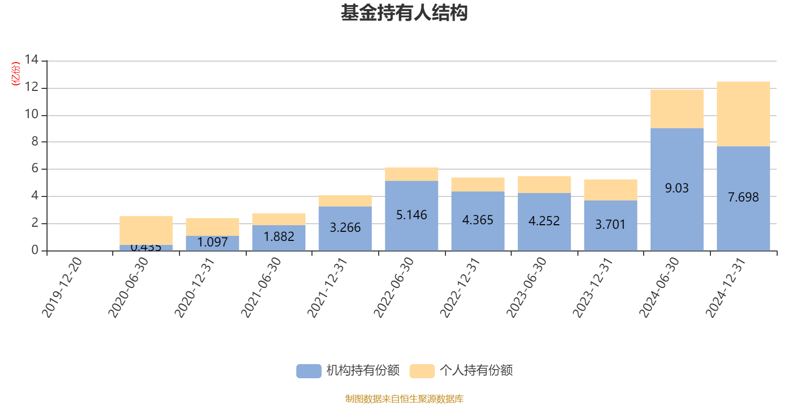 截至2024年12月31日,基金持有人共计39.37万户,合计持有12.45亿份。其中管理人员工持有28.39万份,占比0.02%,机构持有份额占比61.84%,个人投资者占比38.16%。