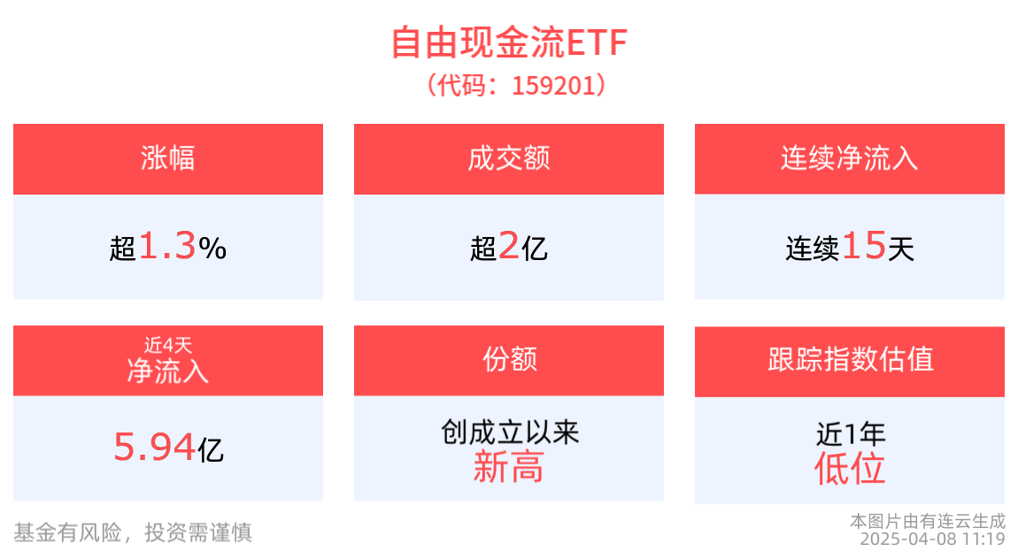 截至2025年4月8日11:19,国证自由现金流指数(980092)上涨0.92%,成分股红旗连锁、大商股份、山东海化涨停,奥瑞金、欧圣电气等跟涨。自由现金流ETF(159201)上涨1.34%,最新价报0.91元。流动性方面,自由现金流ETF盘中换手8.24%,成交2.39亿元。拉长时间看,截至4月7日,自由现金流ETF近1周日均成交4.82亿元。