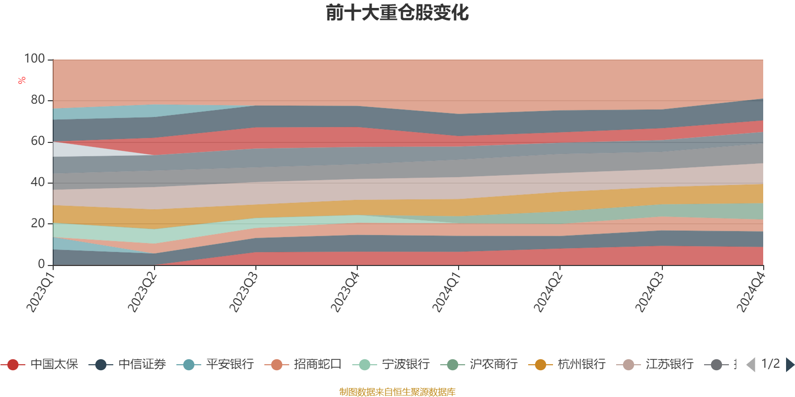 该基金持股集中度较高,近2年前十大重仓股集中度长期超过60%。截至2024年末,基金十大重仓股分别是成都银行、江苏银行、招商银行、杭州银行、中国太保、沪农商行、中信证券、招商蛇口、中国平安、保利发展。