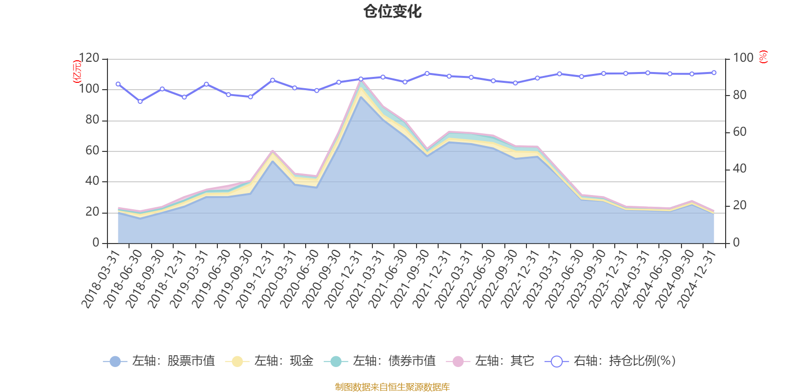 据定期报告数据统计,近三年平均股票仓位为90.79%,同类平均为86.01%。2024年末基金达到92.51%的最高仓位,2018年上半年末最低,为76.9%。