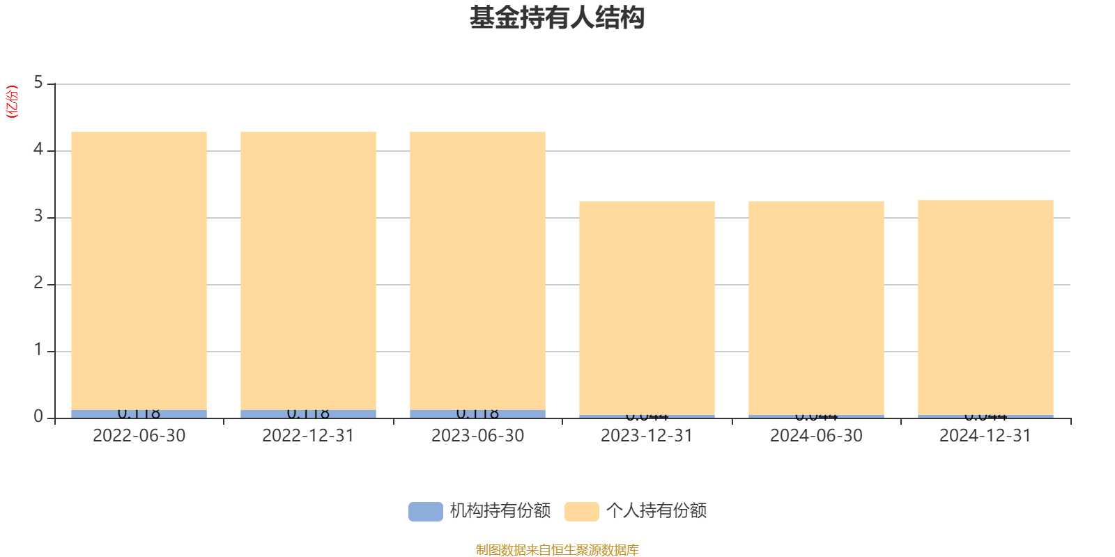 截至2024年12月31日,基金持有人共计6.38万户,合计持有3.26亿份。其中管理人员工持有17.9万份,占比0.05%,机构持有份额占比1.34%,个人投资者占比98.66%。