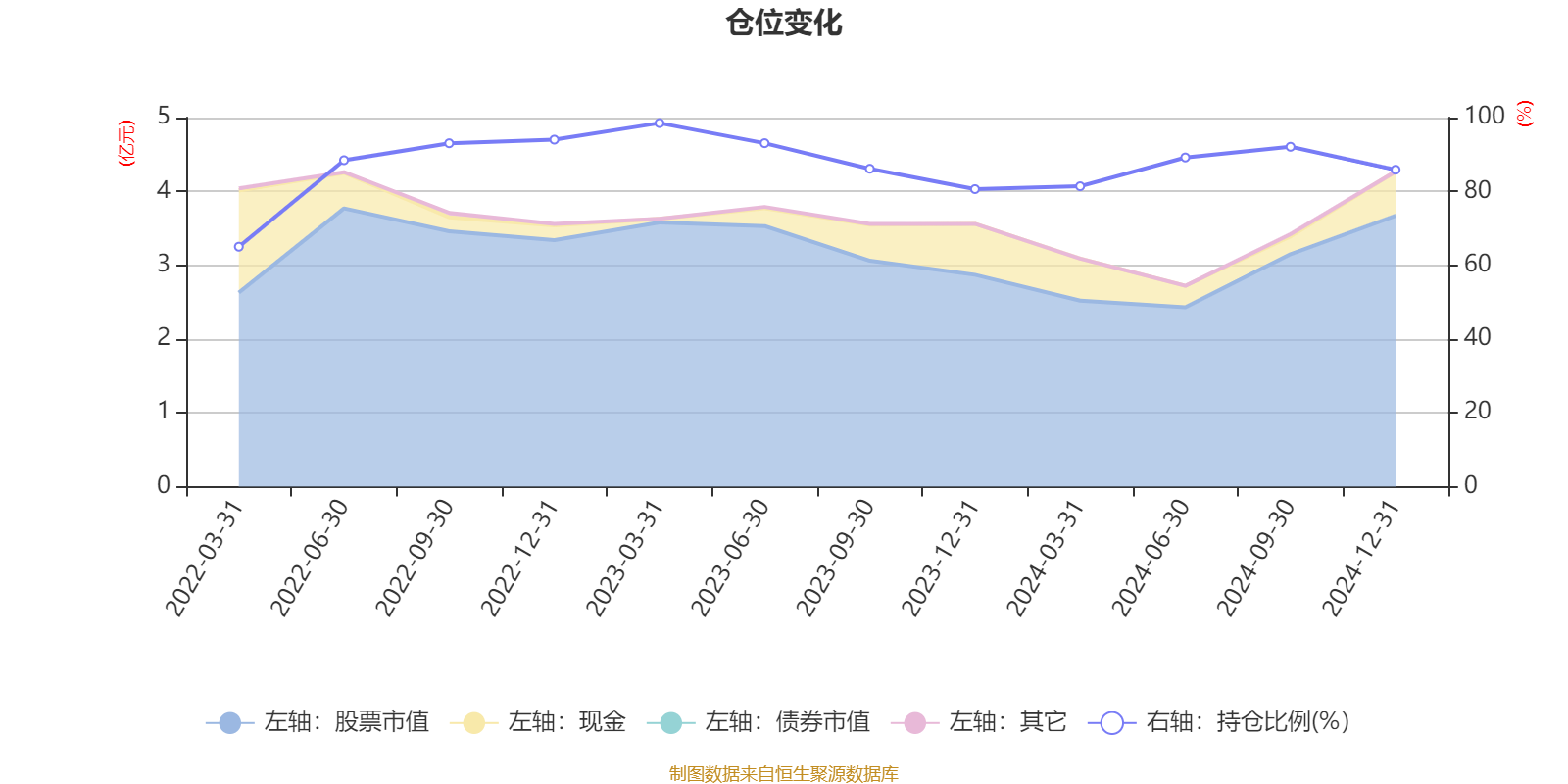 据定期报告数据统计,近三年平均股票仓位为87.29%,同类平均为84.97%。2023年一季度末基金达到98.51%的最高仓位,2022年一季度末最低,为65.01%。