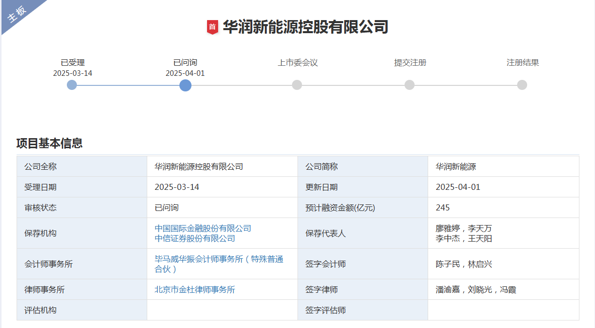4月1日,据深交所官网,华润新能源IPO进入问询阶段,计划募集资金高达245亿元。若此次募资目标得以全额实现,华润新能源将刷新深交所历史,成为其规模最为庞大的IPO项目。