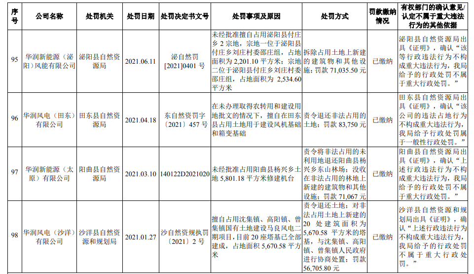 招股书显示,报告期内,华润新能源共受到239项行政处罚,未受到相关监督管理措施、纪律处分或自律监管措施。前述239项行政处罚中,涉及安全生产、建设施工、环保、土地使用、消防等事项,其中,处罚金额在5万元以上的有137项。