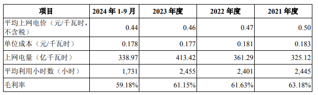 2022年,随着平价上网电量规模增加,风力发电平均上网电价有所下降,使得公司风力发电业务毛利率下降1.55个百分点;2024年前三季度,由于风力发电业务市场化交易电量占比上升,拉低风力发电业务平均上网电价,导致公司当期风力发电业务毛利率下降1.97个百分点。