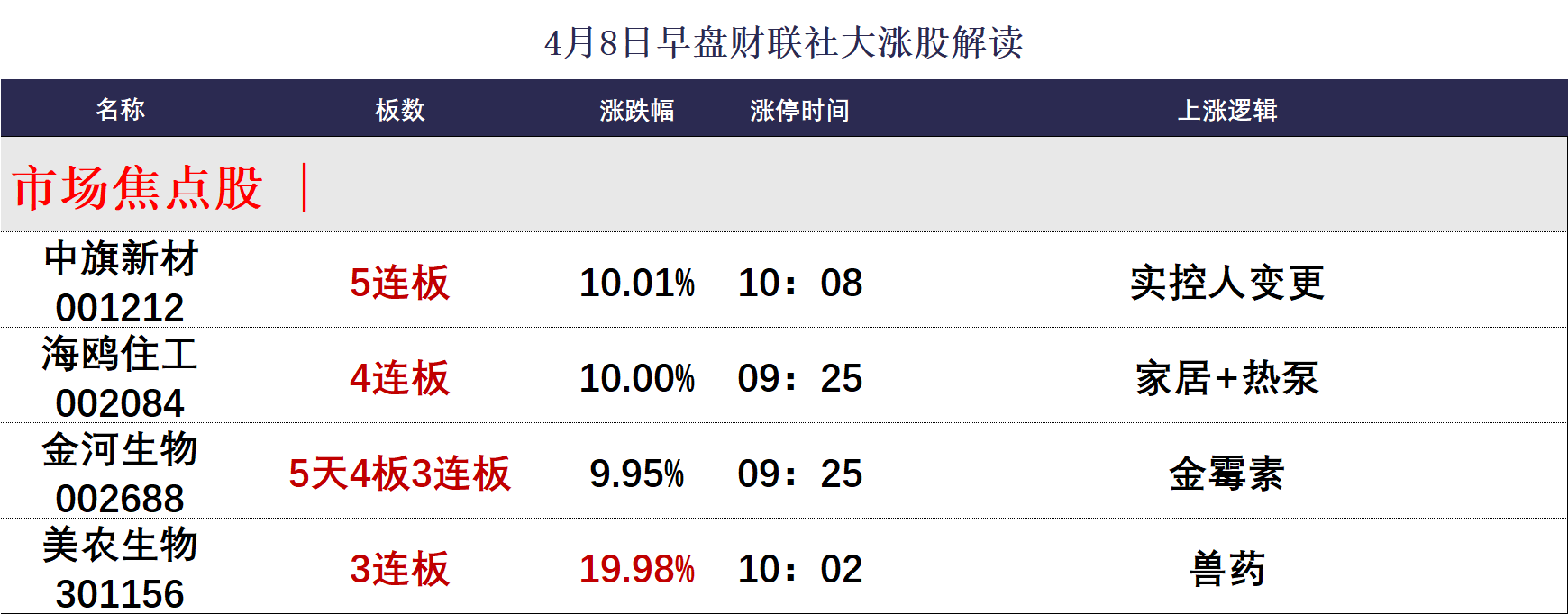 今日午盘全市场共79股涨停,连板股总数14只,13股封板未遂,封板率为86%(不含ST股、退市股)。焦点股方面,中旗新材T字涨停晋级5连板,兽药板块金河生物5天4板,美农生物20CM3连板。