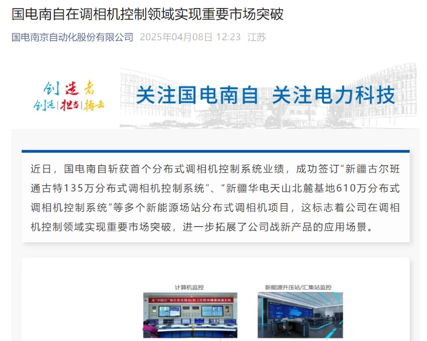 每经AI快讯,近日,国电南自斩获首个分布式调相机控制系统业绩,成功签订“新疆古尔班通古特135万分布式调相机控制系统”、“新疆华电天山北麓基地610万分布式调相机控制系统”等多个新能源场站分布式调相机项目,这标志着公司在调相机控制领域实现重要市场突破,进一步拓展了公司战新产品的应用场景。