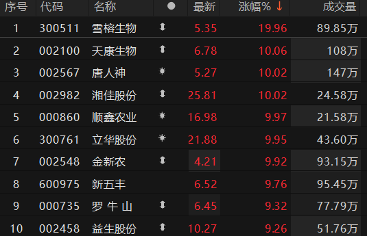 4月8日,猪肉概念走高,截至13时41分,天康生物、唐人神、湘佳股份、金新农涨停,雪榕生物此前涨停,新五丰逼近涨停。