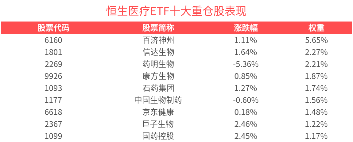 数据显示,截至2025年4月7日,恒生医疗保健指数(HSHCI)前十大权重股分别为百济神州(06160)、药明生物(02269)、信达生物(01801)、康方生物(09926)、石药集团(01093)、中国生物制药(01177)、京东健康(06618)、巨子生物(02367)、阿里健康(00241)、翰森制药(03692),前十大权重股合计占比55.21%。