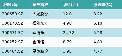 截至收盘,无线耳机主题涨跌幅最高的五只股票为:太龙股份(300650.SZ)、福能东方(300173.SZ)、富满微(300671.SZ)、金信诺(300252.SZ)与星徽股份(300464.SZ)。详情见下表: