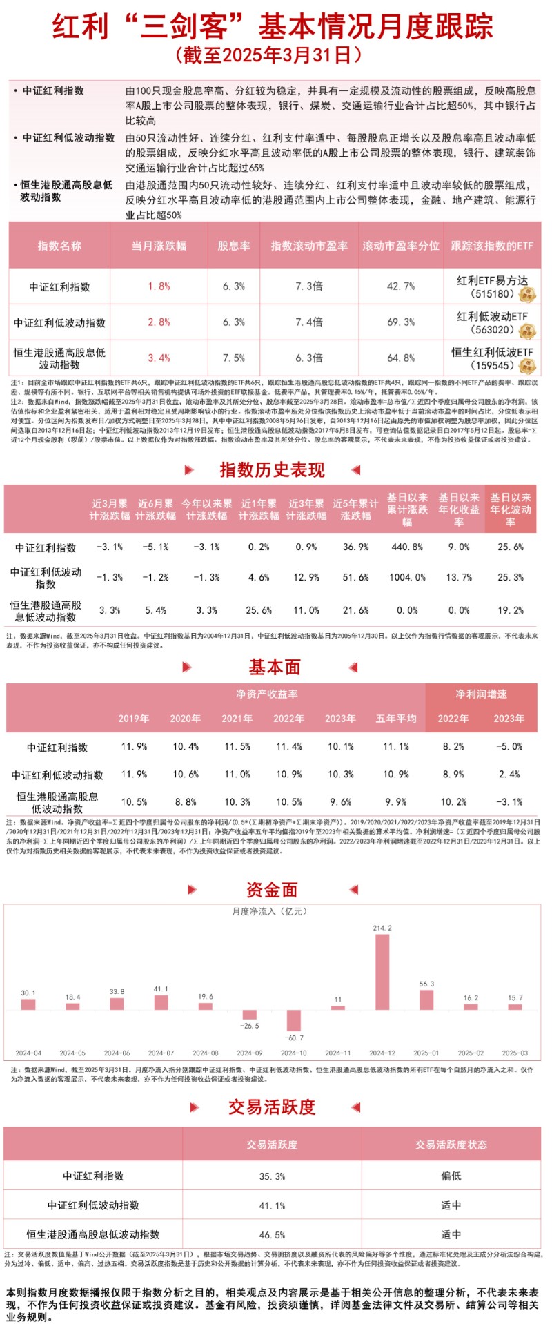3月,中证红利低波动指数上涨2.8%,中证红利指数上涨1.8%,恒生港股通高股息低波动指数上涨3.4%。