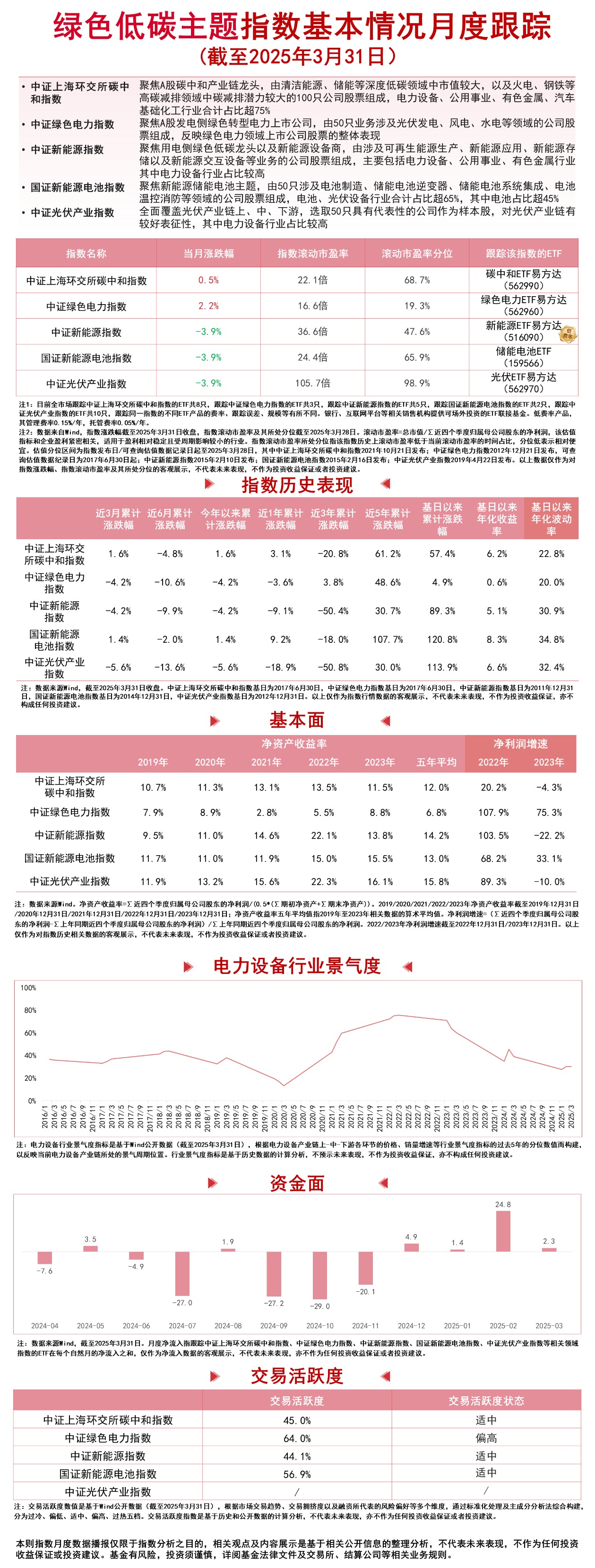 3月,中证绿色电力指数上涨2.2%,中证上海环交所碳中和指数上涨0.5%,中证新能源指数下跌3.9%,国证新能源电池指数下跌3.9%,中证光伏产业指数下跌3.9%。