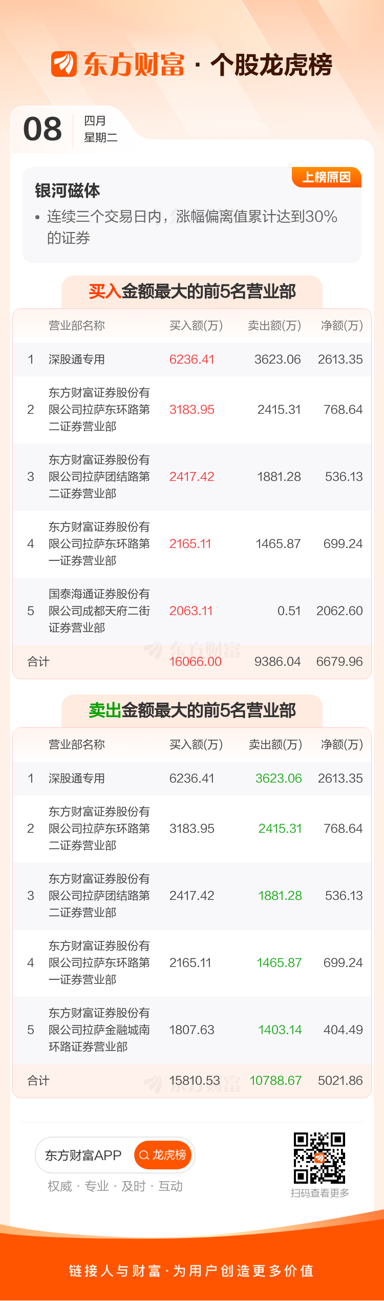 交易所2025年4月8日公布的交易公开信息显示,银河磁体因成为连续三个交易日内,涨幅偏离值累计达到30%的证券上榜。银河磁体当日收报29.35元,涨跌幅15.32%,换手率20.00%,成交额12.63亿。异常期间4月7日至4月8日,期间涨幅19.50%,累计偏离值32.09%,区间成交额21.91亿。