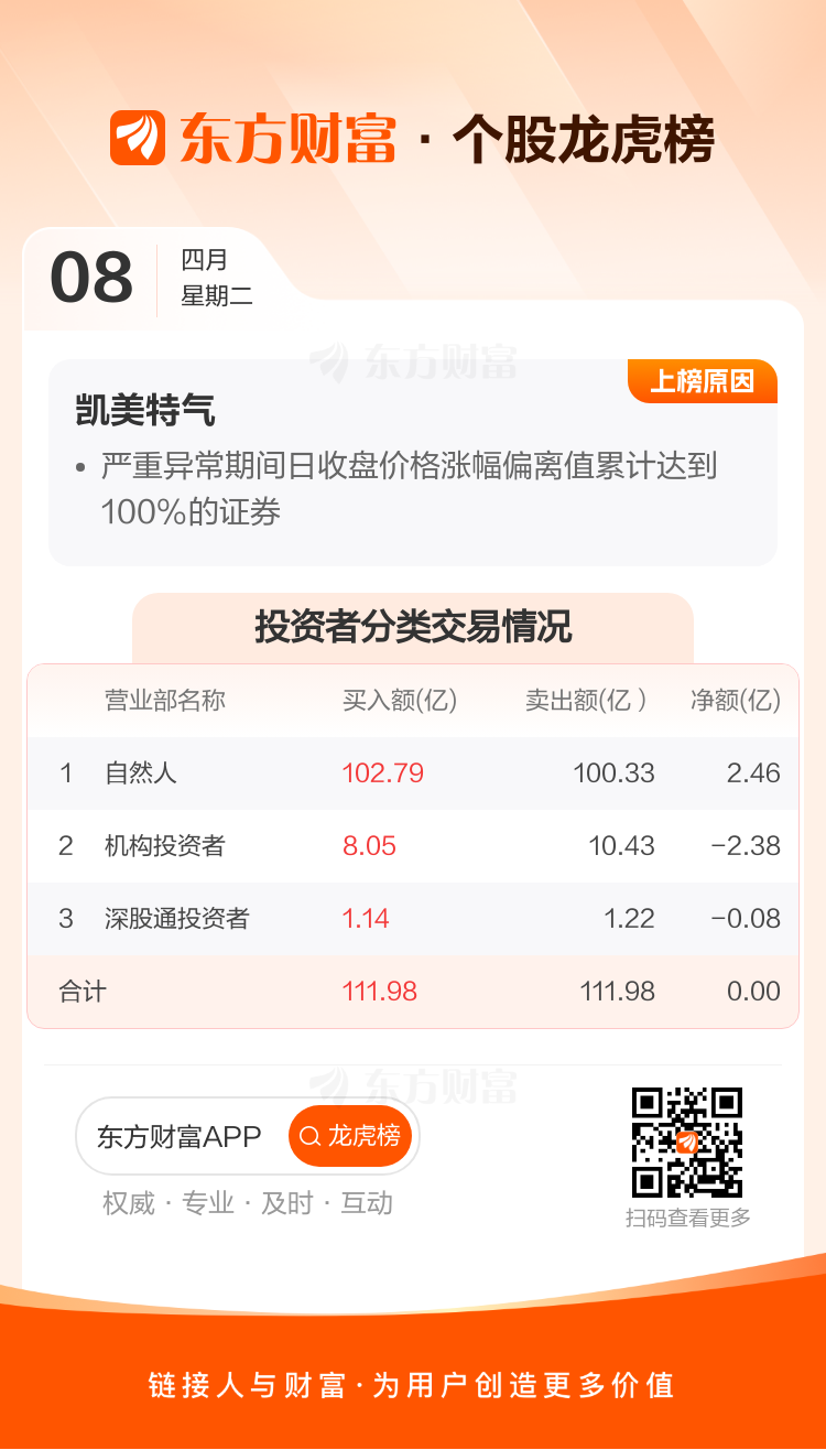 交易所2025年4月8日公布的交易公开信息显示,凯美特气因成为日涨幅偏离值达到7%的前5只证券、严重异常期间日收盘价格涨幅偏离值累计达到100%的证券上榜。凯美特气当日收报12.23元,涨跌幅9.98%,偏离值9.19%,换手率31.64%,成交额25.00亿。严重异常期间3月27日至4月8日,期间涨幅95.06%,累计偏离值107.49%,区间成交额111.98亿。