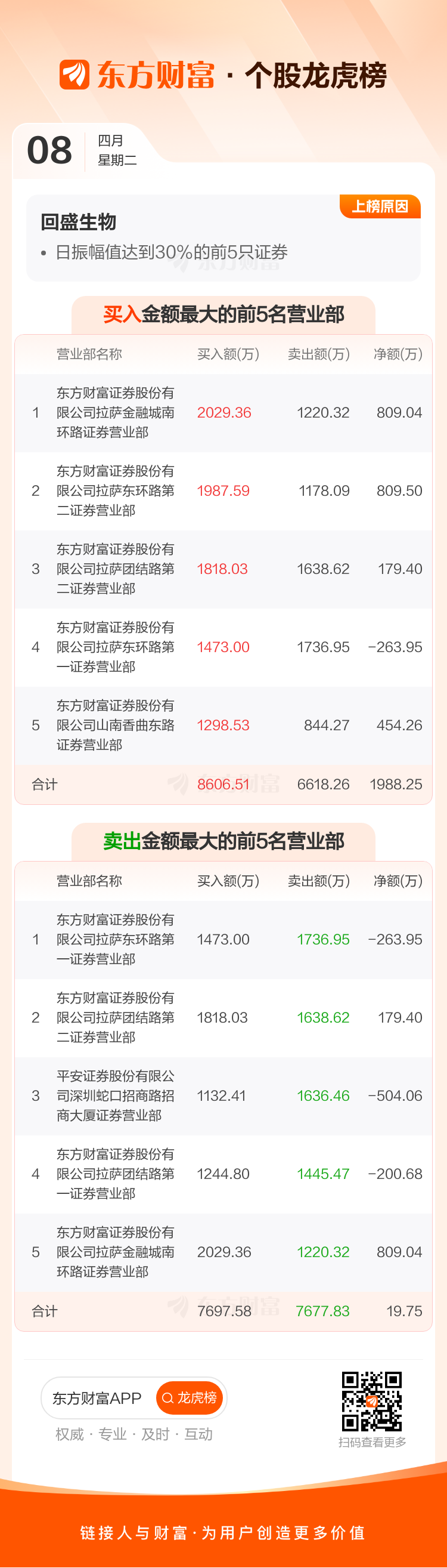 交易所2025年4月8日公布的交易公开信息显示,回盛生物因成为日振幅值达到30%的前5只证券上榜。回盛生物当日收报34.81元,涨跌幅7.77%,偏离值34.24%,换手率29.12%,成交额15.89亿。