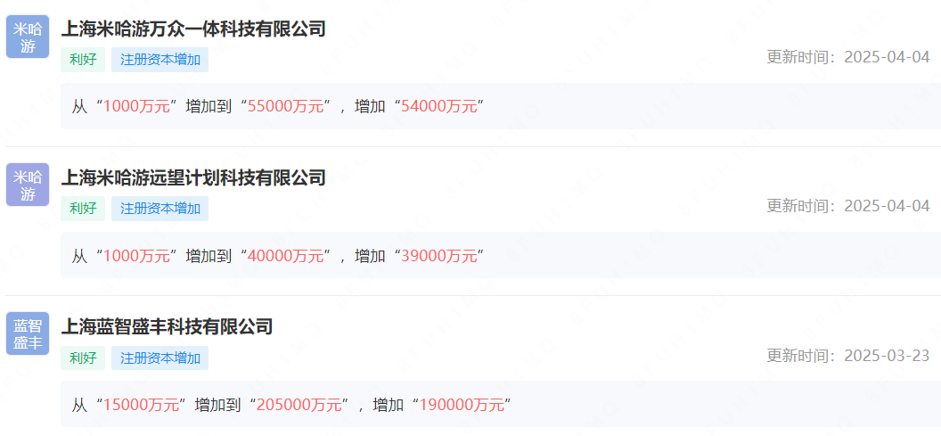 上海米哈游远望计划科技有限公司(以下简称“远望计划”)、上海米哈游万众一体科技有限公司(以下简称“万众一体”)注册资本均从1000万元分别增至4亿、5.5亿元,增幅分别高达3900%和5400%;上海蓝智盛丰科技有限公司(以下简称“蓝智盛丰”)注册资本则从1.5亿元增至20.5亿元,增幅1267%。