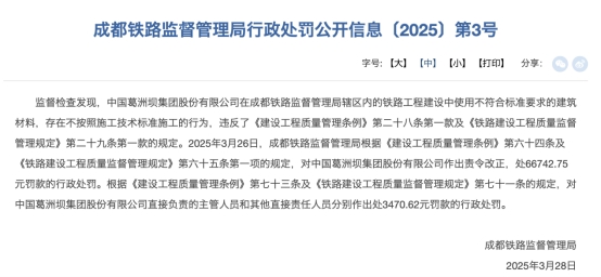 此次处罚源于监管部门在监督检查中发现,葛洲坝集团在铁路工程中使用的建材未达到标准要求,且存在未按施工技术标准操作的行为,违反了《建设工程质量管理条例》第二十八条第一款及《铁路建设工程质量监督管理规定》第二十九条第一款的规定。成都铁路监督管理局根据《建设工程质量管理条例》及《铁路建设工程质量监督管理规定》,对葛洲坝集团作出责令改正,处以66742.75元罚款。同时,该公司直接负责的主管人员和其他直接责任人员分别被罚款3470.62元。