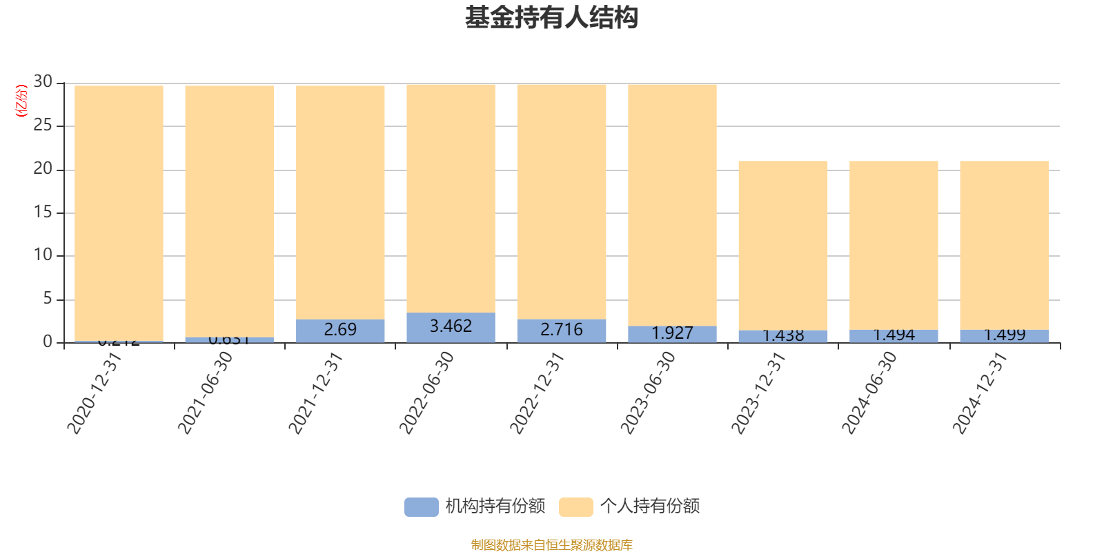 截至2024年12月31日,基金持有人共计5.12万户,合计持有20.97亿份。其中管理人员工持有11.31万份,占比0.01%,机构持有份额占比7.15%,个人投资者占比92.85%。