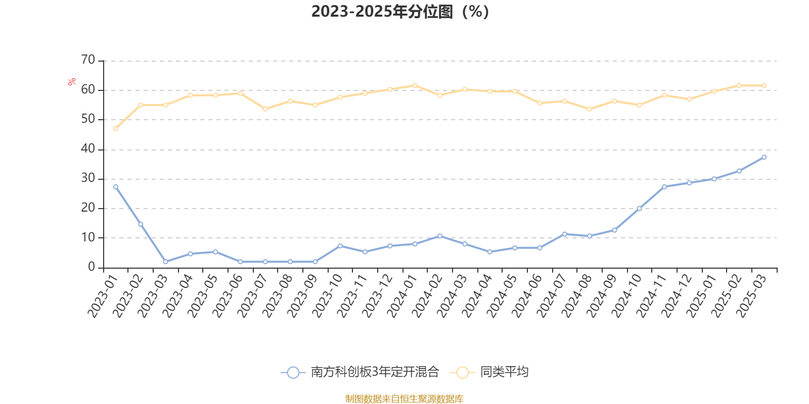 通过所选区间该基金净值增长率分位图,可以观察该基金与同类基金业绩比较情况。图为坐标原点到区间内某时点的净值增长率在同类基金中的分位数。