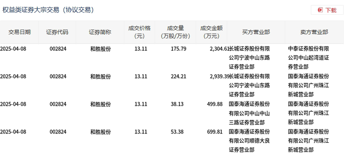 4月8日,和胜股份大宗交易成交491.51万股,成交额6443.69万元,占当日总成交额的26.42%,成交价13.11元,较市场收盘价13.58元折价3.46%。