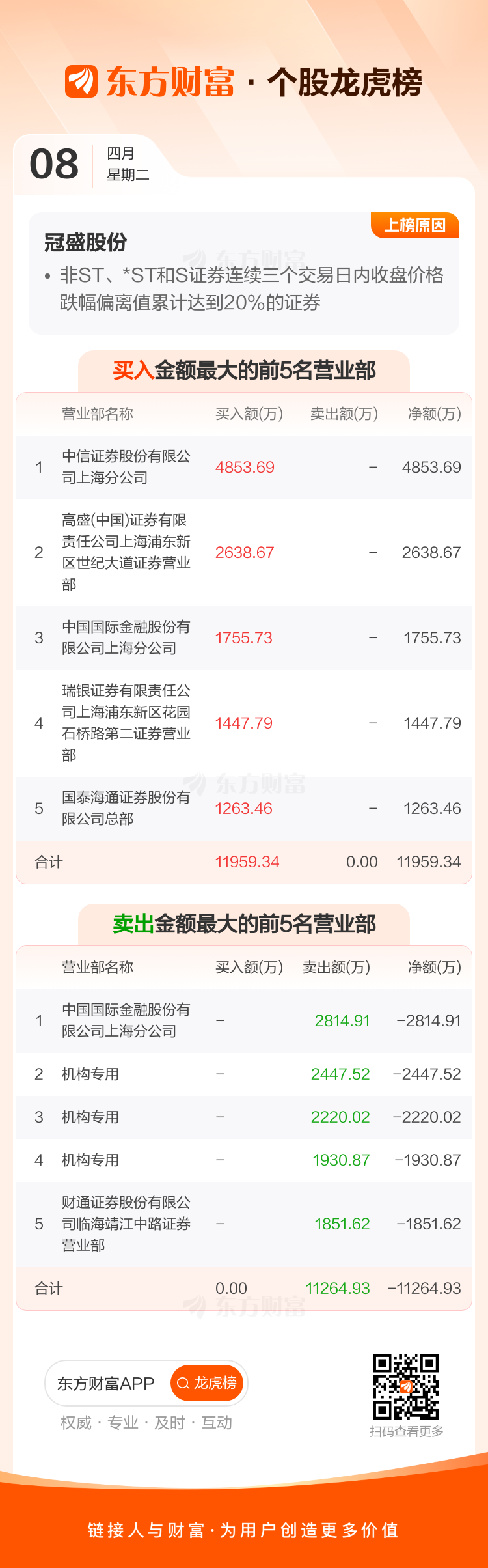 交易所2025年4月8日公布的交易公开信息显示,冠盛股份因成为非ST、*ST和S证券连续三个交易日内收盘价格跌幅偏离值累计达到20%的证券上榜。冠盛股份当日收报27.78元,涨跌幅-10.01%,换手率3.83%,成交额1.90亿。异常期间4月3日至4月8日,期间涨幅-26.74%,累计偏离值-20.64%,区间成交额5.73亿。