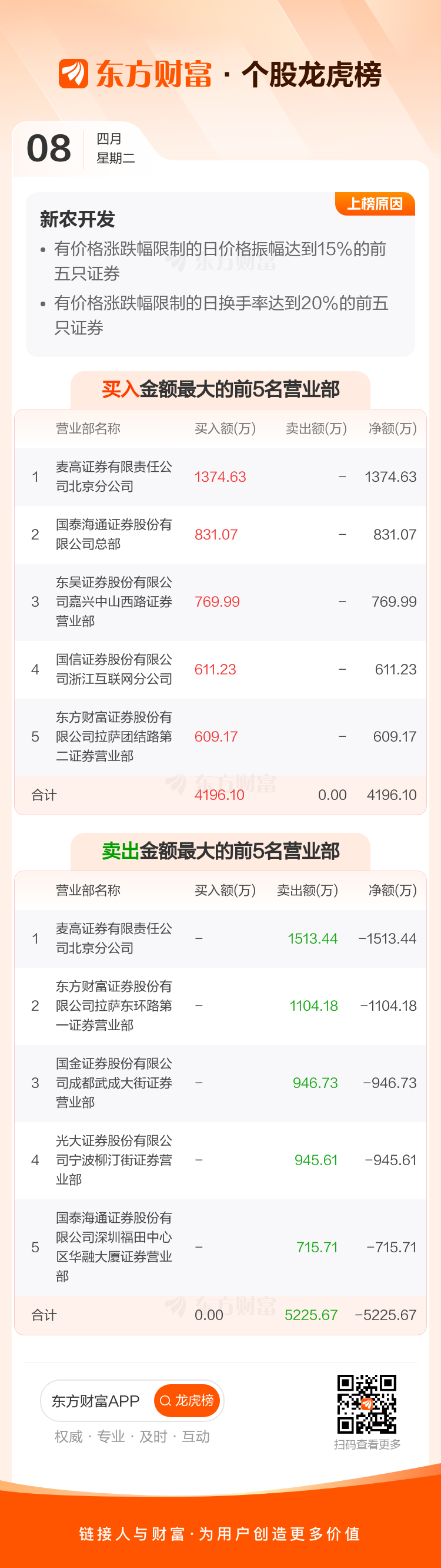 交易所2025年4月8日公布的交易公开信息显示,新农开发因成为有价格涨跌幅限制的日价格振幅达到15%的前五只证券、有价格涨跌幅限制的日换手率达到20%的前五只证券上榜。新农开发当日收报8.24元,涨跌幅9.57%,偏离值22.16%,换手率22.18%,成交额6.52亿。