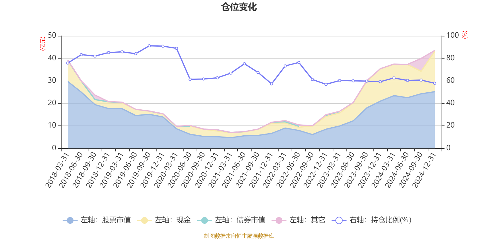 据定期报告数据统计,近三年平均股票仓位为62.37%,同类平均为85.84%。2019年三季度末基金达到91.17%的最高仓位,2022年末最低,为56.92%。