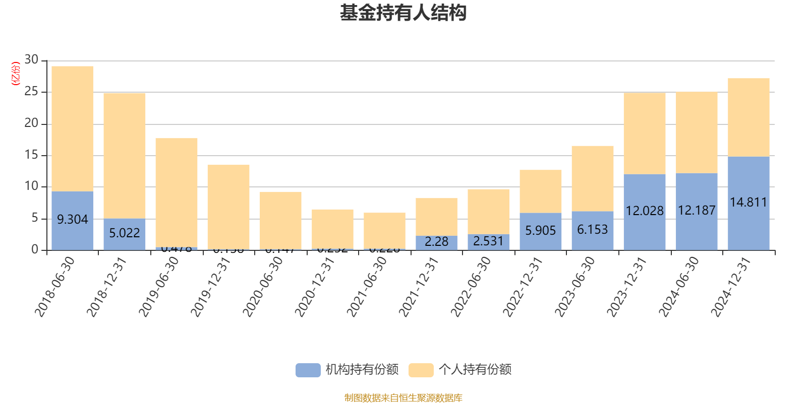 截至2024年12月31日,基金持有人共计20.41万户,合计持有27.19亿份。其中管理人员工持有179.64万份,占比0.07%,机构持有份额占比54.47%,个人投资者占比45.53%。