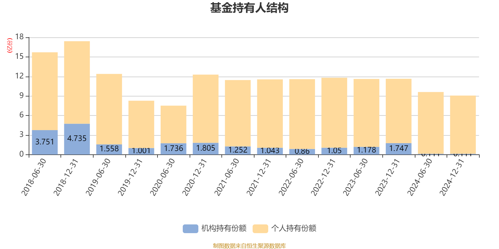 截至2024年12月31日,基金持有人共计63.5万户,合计持有9.06亿份。其中管理人员工持有253.75万份,占比0.28%,机构持有份额占比1.23%,个人投资者占比98.77%。